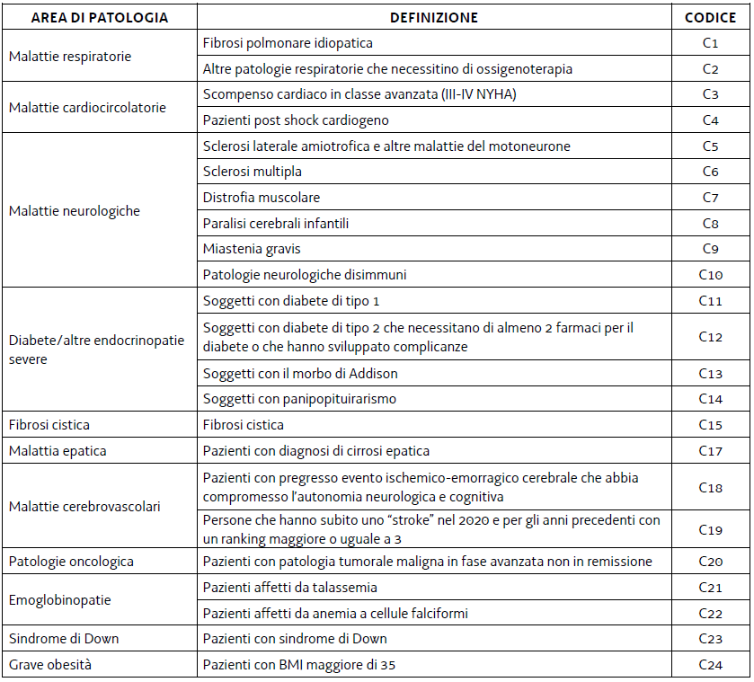 Secondo quanto stabilito dal Ministero della salute nelle "Raccomandazioni ad interim sui gruppi target della vaccinazione anti-SARS-CoV-2/COVI D-19" del 10 marzo 2021 appartengono alla categoria delle persone a elevata fragilità quelle riferibili alla seguente tabella: